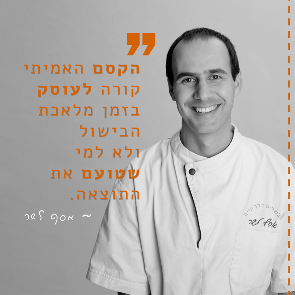 “ אסף לשר המדהים מלמד בצורה פשוטה ופרקטית ולא אגזים ואציין שהלימוד בקורס שינה את חיי המשפחה שלי, ממש נקודת מפנה כשם שאחרי החתונה והלידה הכל השתנה לי. והכי חשוב שאני אוהבת לבשל! כל כך כיף לבשל וכולם נהנים לאכול שלא לדבר על כך שאוכל טעים מלכד ומחבר יותר מבחינתי. ולכולם ממליצה מהלב, מהנשמה לעשות את הקורס ולהצליח לבשל אוכל מזין וטעים בבית.” מירב “אסף היקר, תודה רבה על קורס טעים ומהנה מאין כמוהו! למדתי לבשל ולעשות את זה בכייף גדול ובקלילות אדירה. למדתי שלא צריך הרבה כדי לבשל טעים…אין לי ספק שעקרונות הבישול והמתכונים שקיבלתי ילוו אותי ואת משפחתי בהמשך הדרך…תודה על מי שאתה ועל הדרך הנעימה בה העברת לנו את התכנים…תודה” דורית אדמסקי